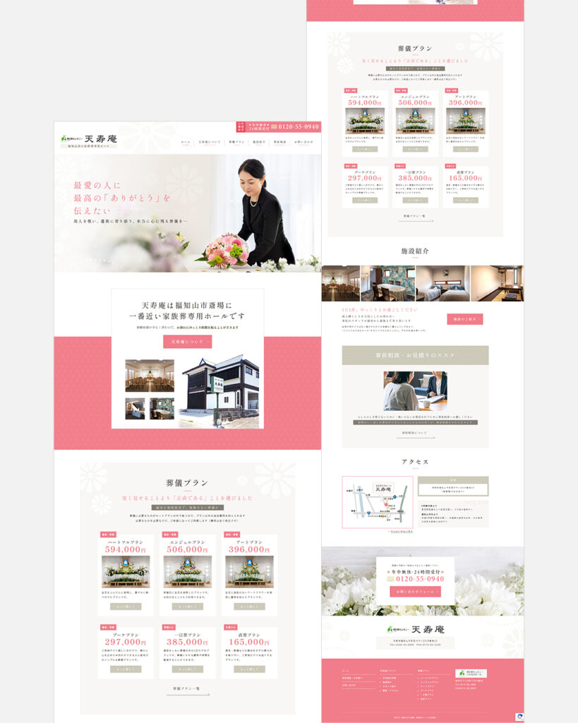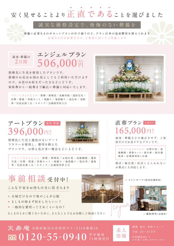ホームページ・チラシは天寿庵の雰囲気やプランがわかりやすく伝わるように設計・デザインいたしました。