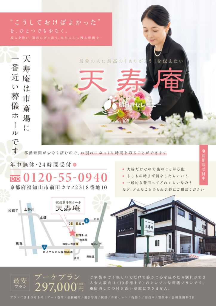 私は普段フリーランスのデザイナーをしているのですが、この度福知山の葬儀場『天寿庵』様のホームページ・チラシを制作させていただきました!